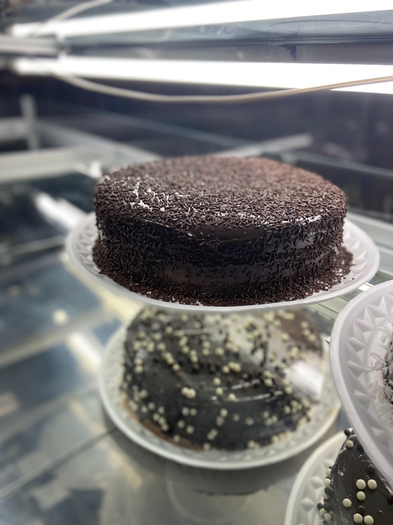 massa chocolate, recheio mousse de chocolate ao leite e cobertura de brigadeiro