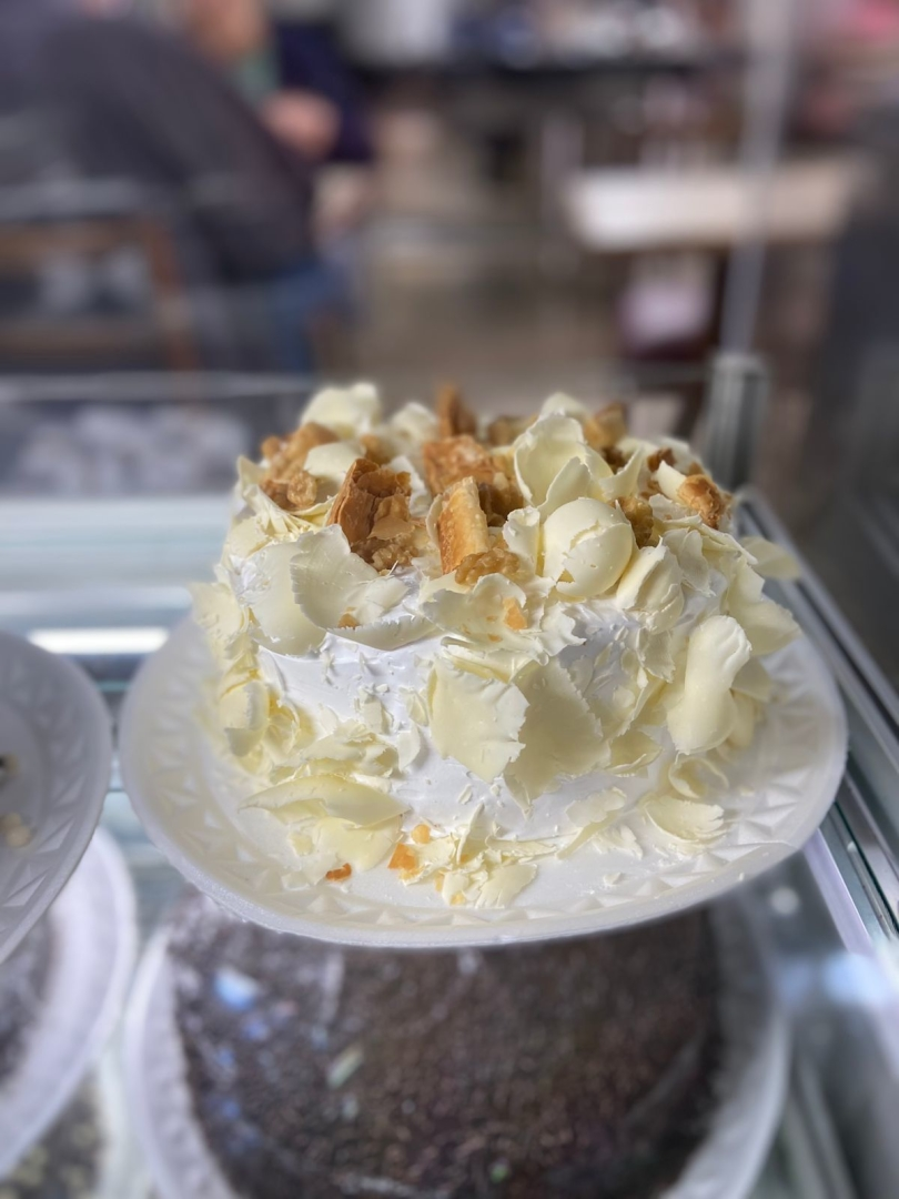 massa baunilha, recheio nozes com massa folhada e cobertura de marshmallow