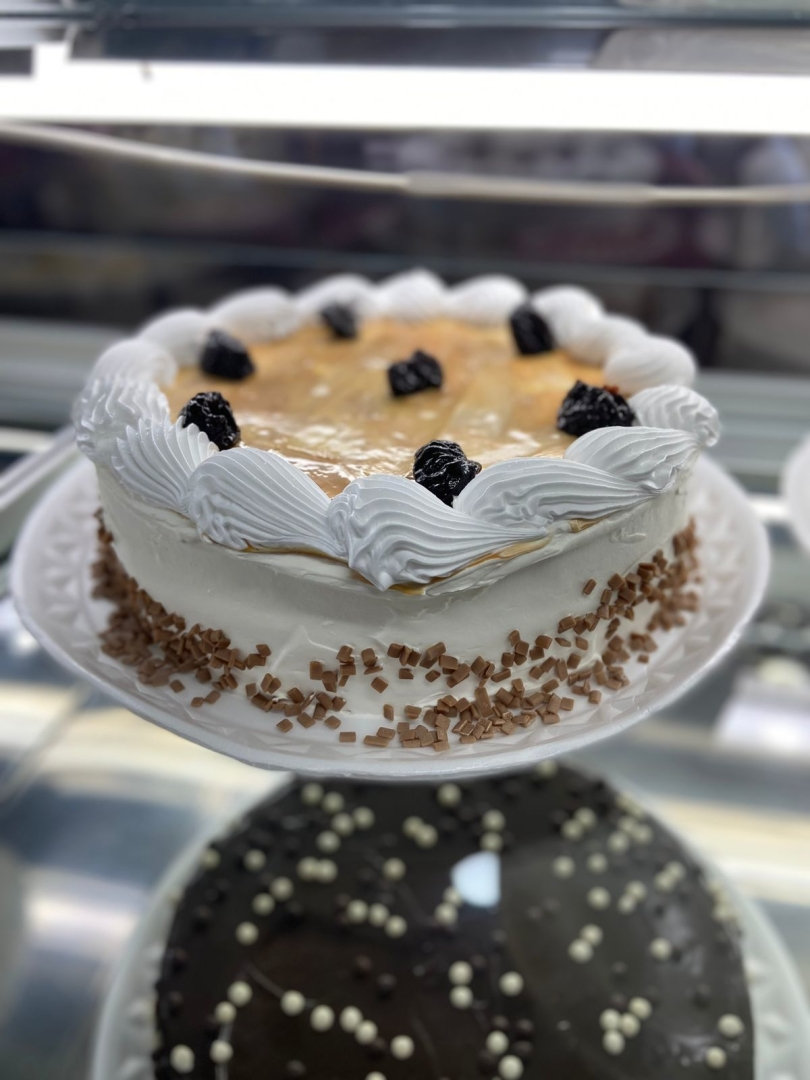 massa baunilha, recheio ameixa com doce de leite e cobertura de chantilly