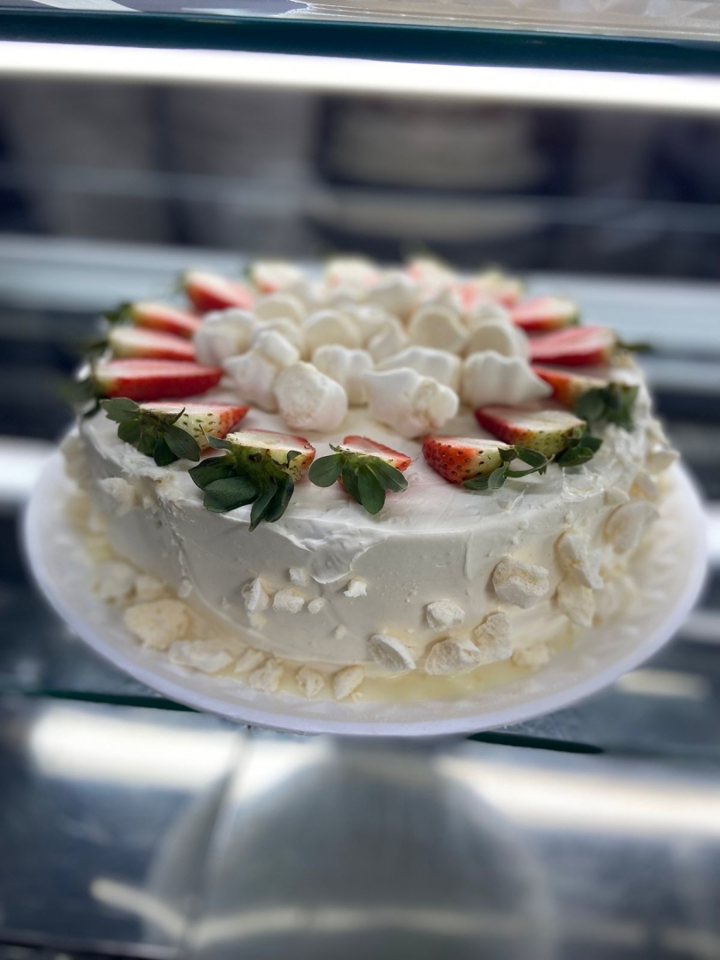 Massa de baunilha, recheio de merengue com morangos e suspiros e cobertura de chantilly, suspiros e morangos frescos.