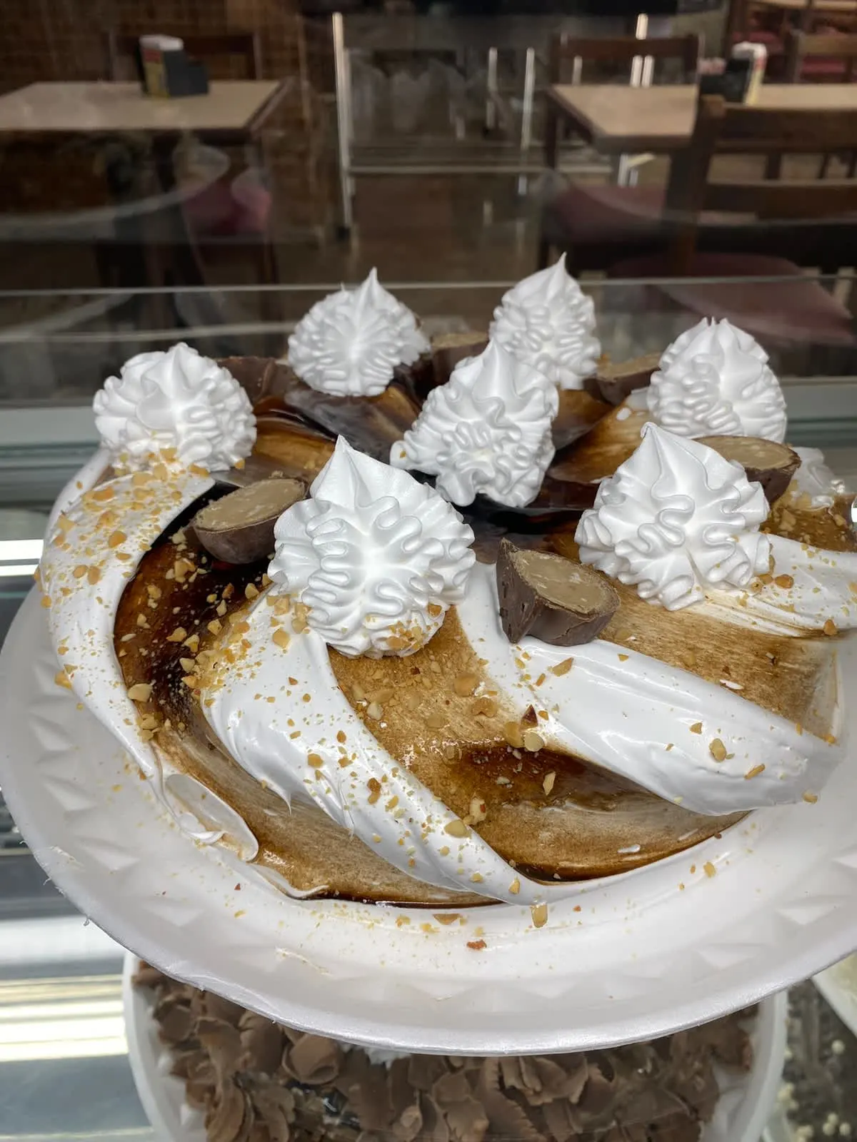 Massa de baunilha, recheio de merengue com morangos e suspiros e cobertura de chantilly, suspiros e morangos frescos.