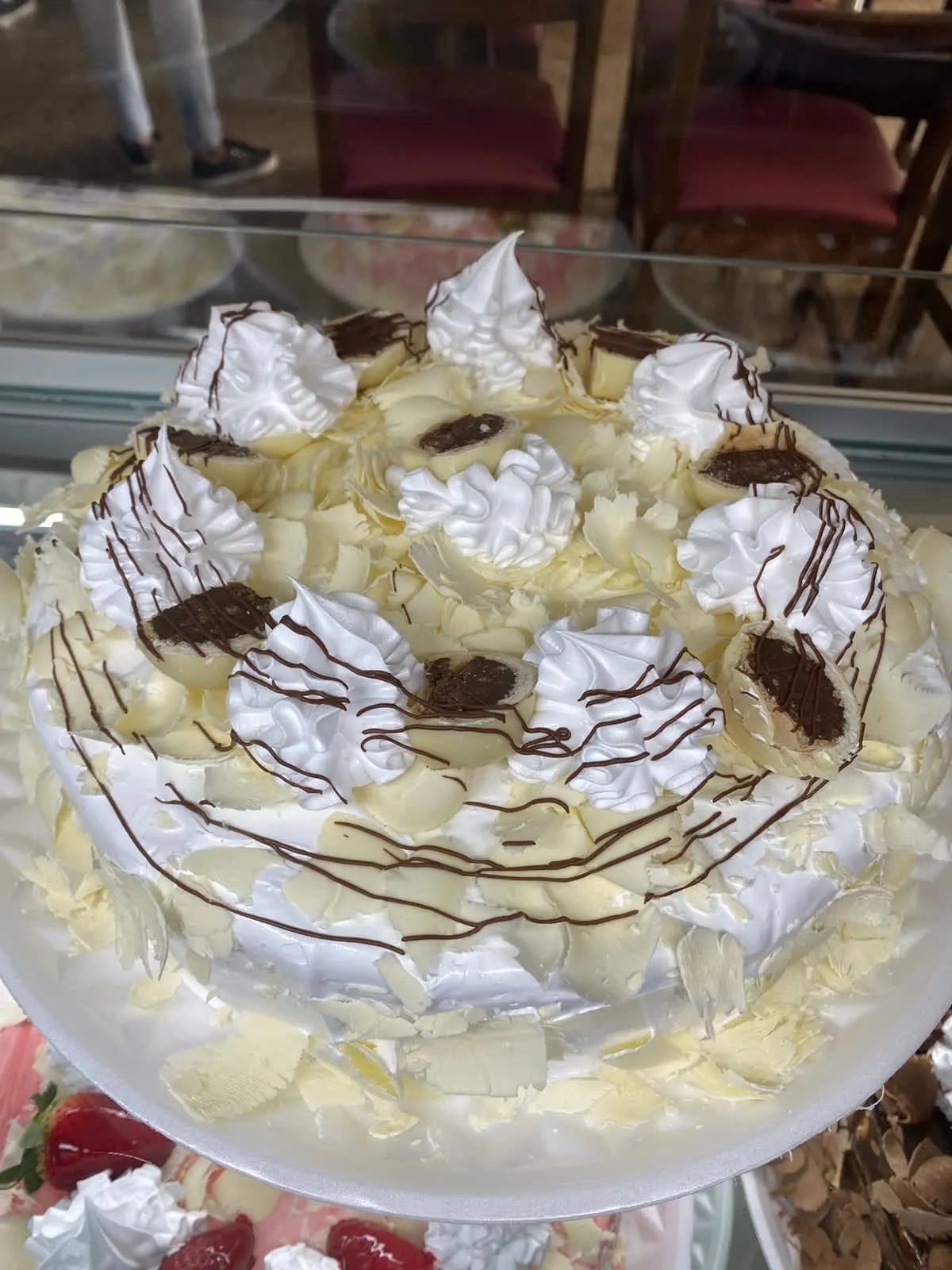 Bolo com recheio de mousse de chocolate branco. Selecione a massa e cobertura que deseja.