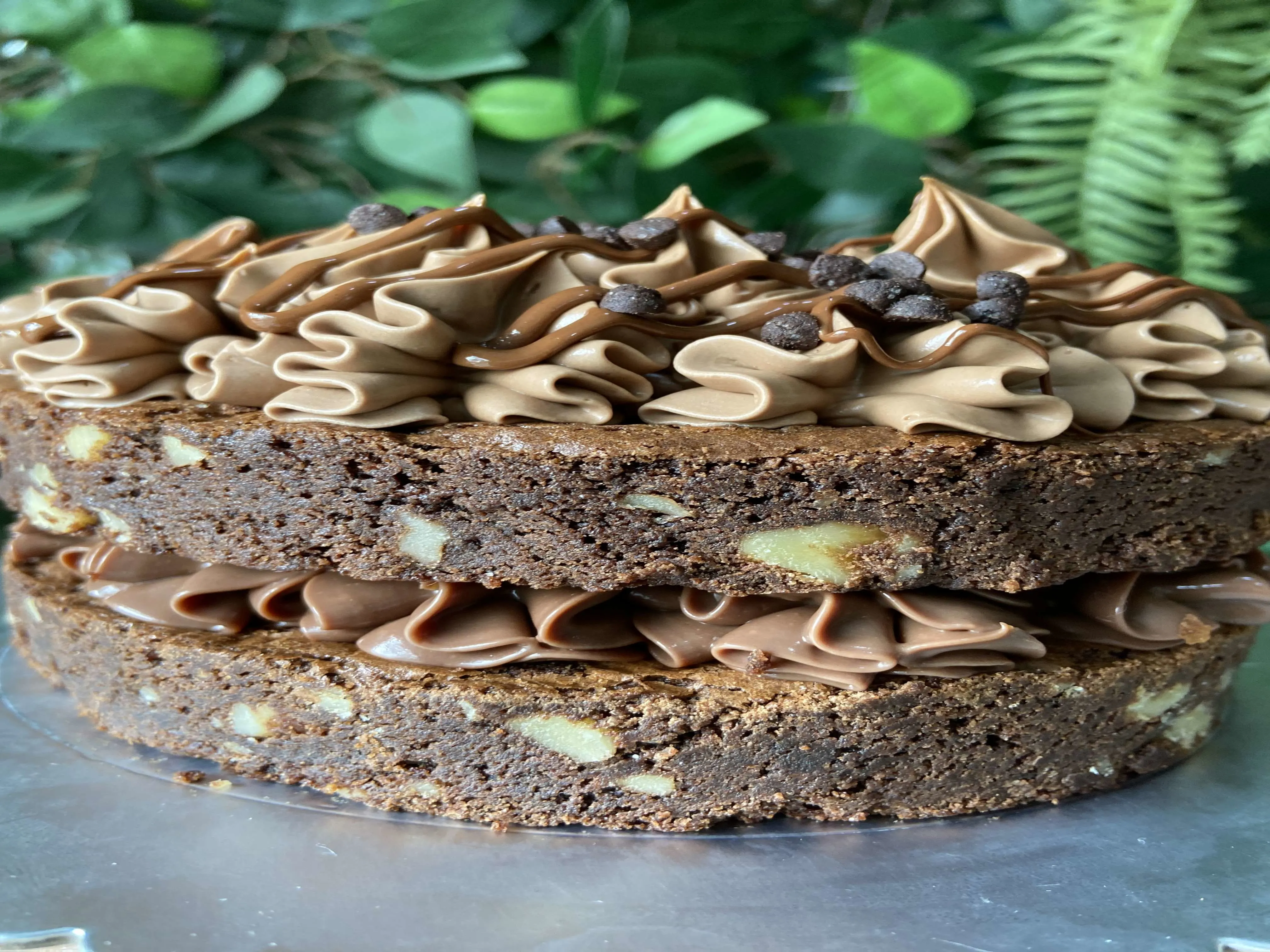 Bolo com 2 discos de massa de brownie e recheio de sua preferência.