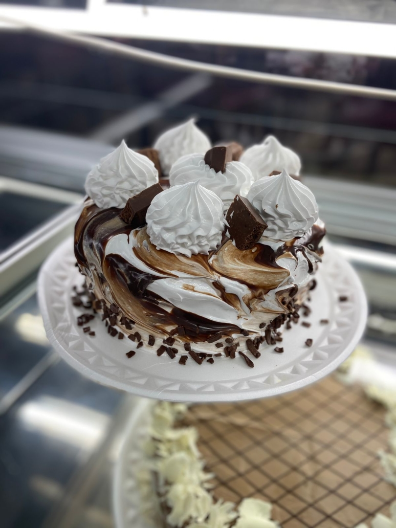 massa chocolate, recheio mousse de chocolate ao leite e cobertura de marshmallow
