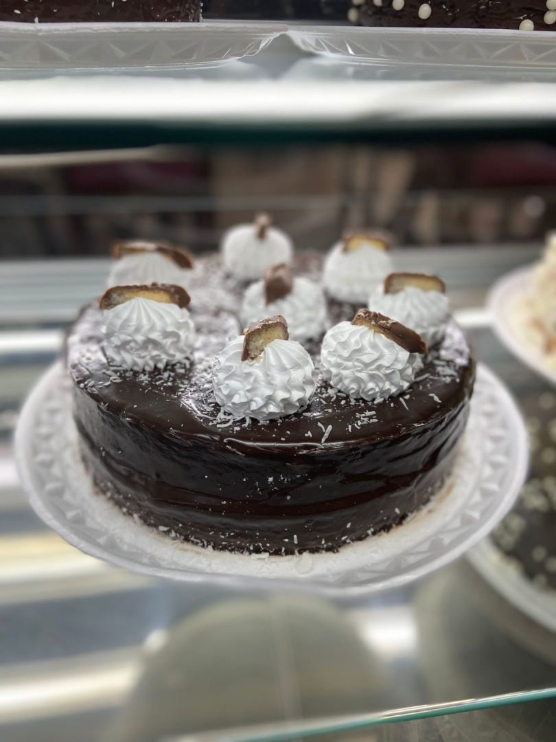 Massa de chocolate, recheio de brigadeiro branco e cobertura de brigadeiro