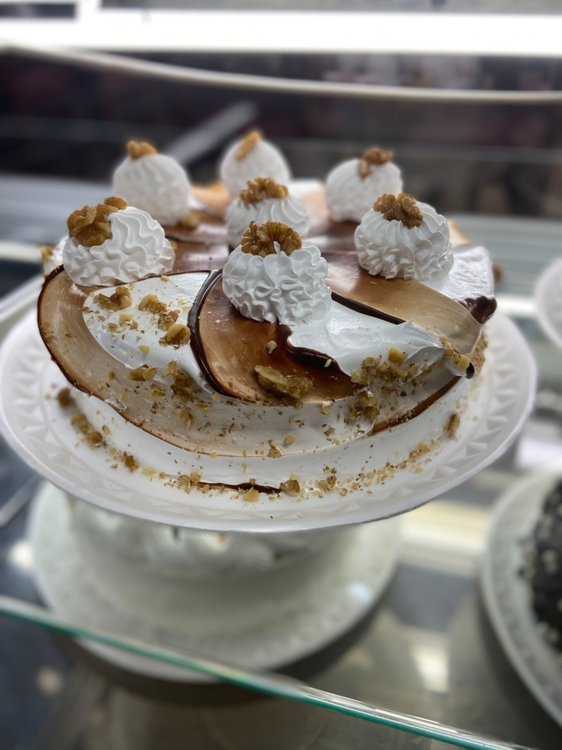 massa baunilha, recheio brig. branco com nozes e cobertura de marshmallow