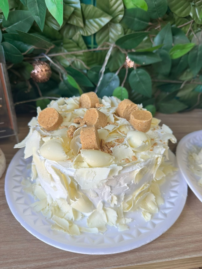 Bolo com recheio de mousse de chocolate branco com paçoca. Selecione a massa e a cobertura que deseja.