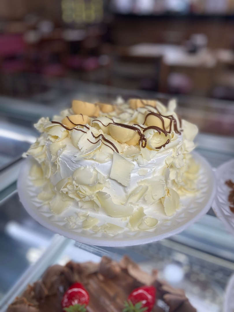 massa baunilha, recheio mousse de chocolate branco e cobertura de chantilly
