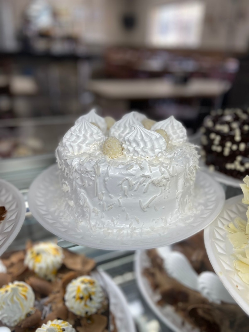 massa baunilha, recheio beijinho e cobertura de marshmallow