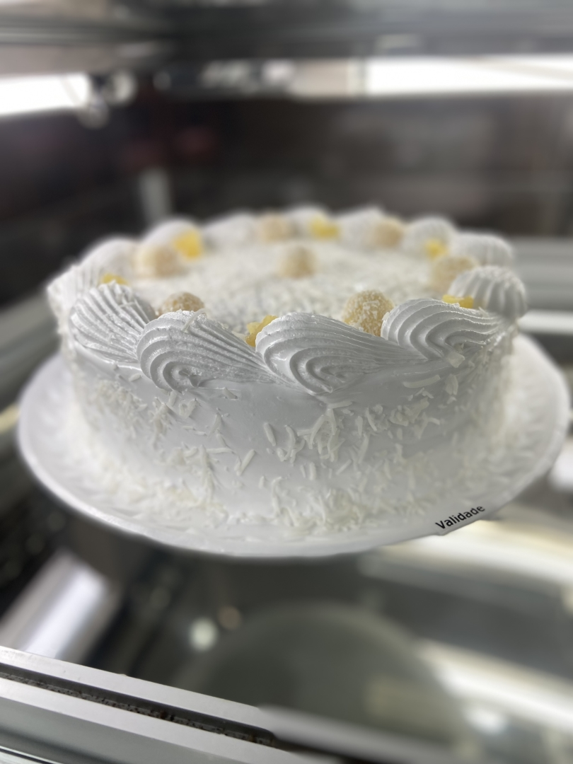 Massa baunilha, recheio abacaxi com coco e cobertura de marshmallow